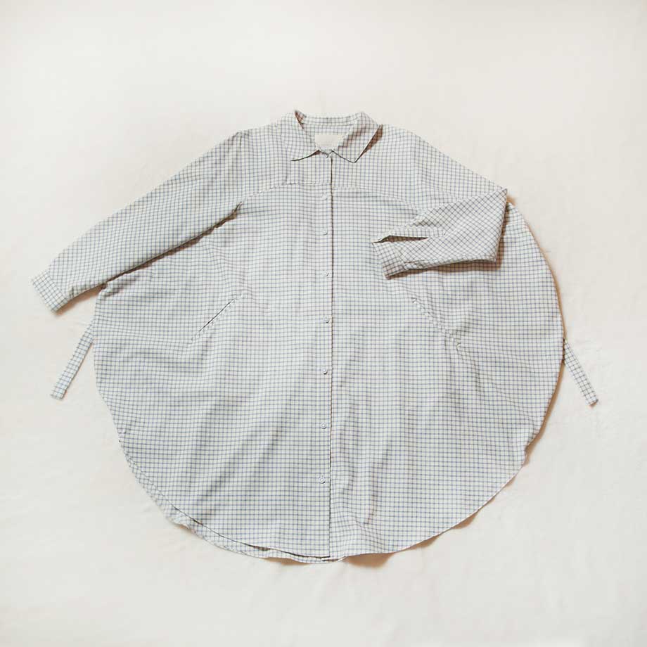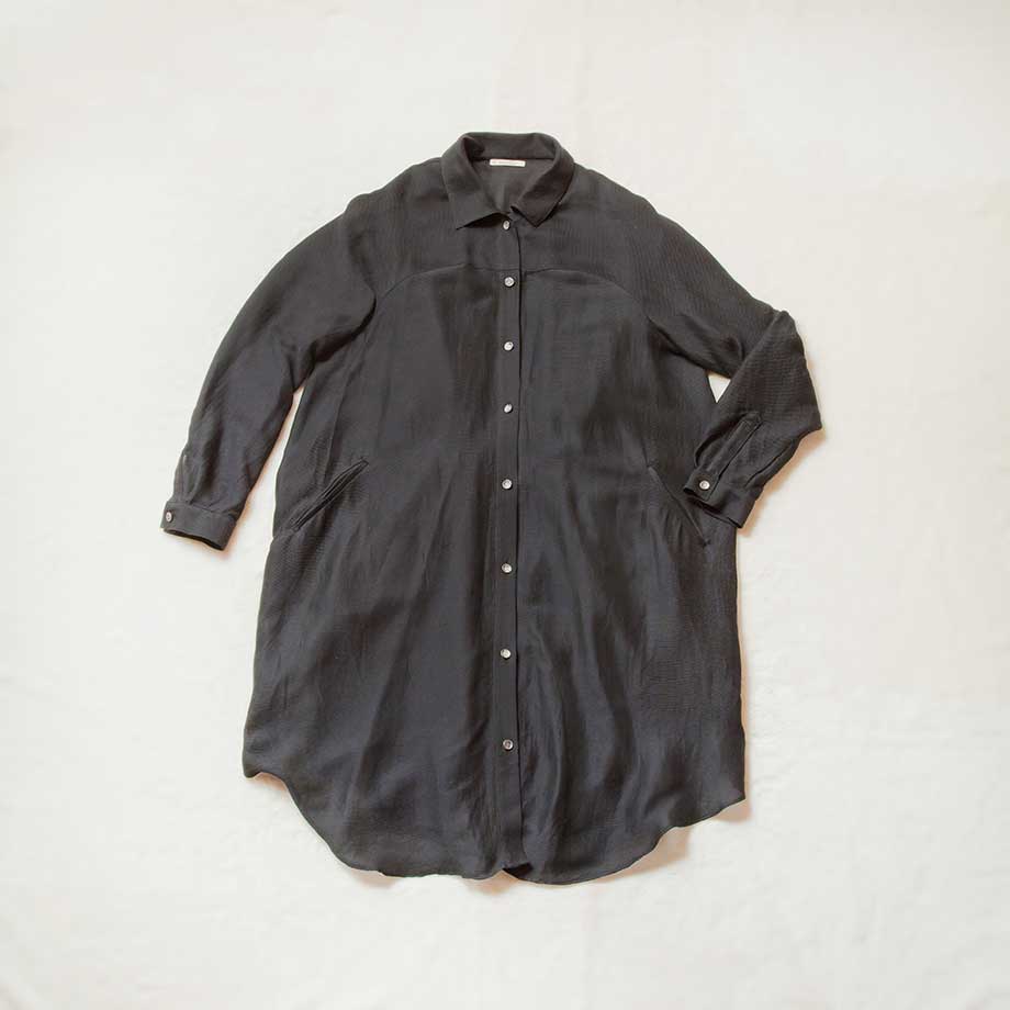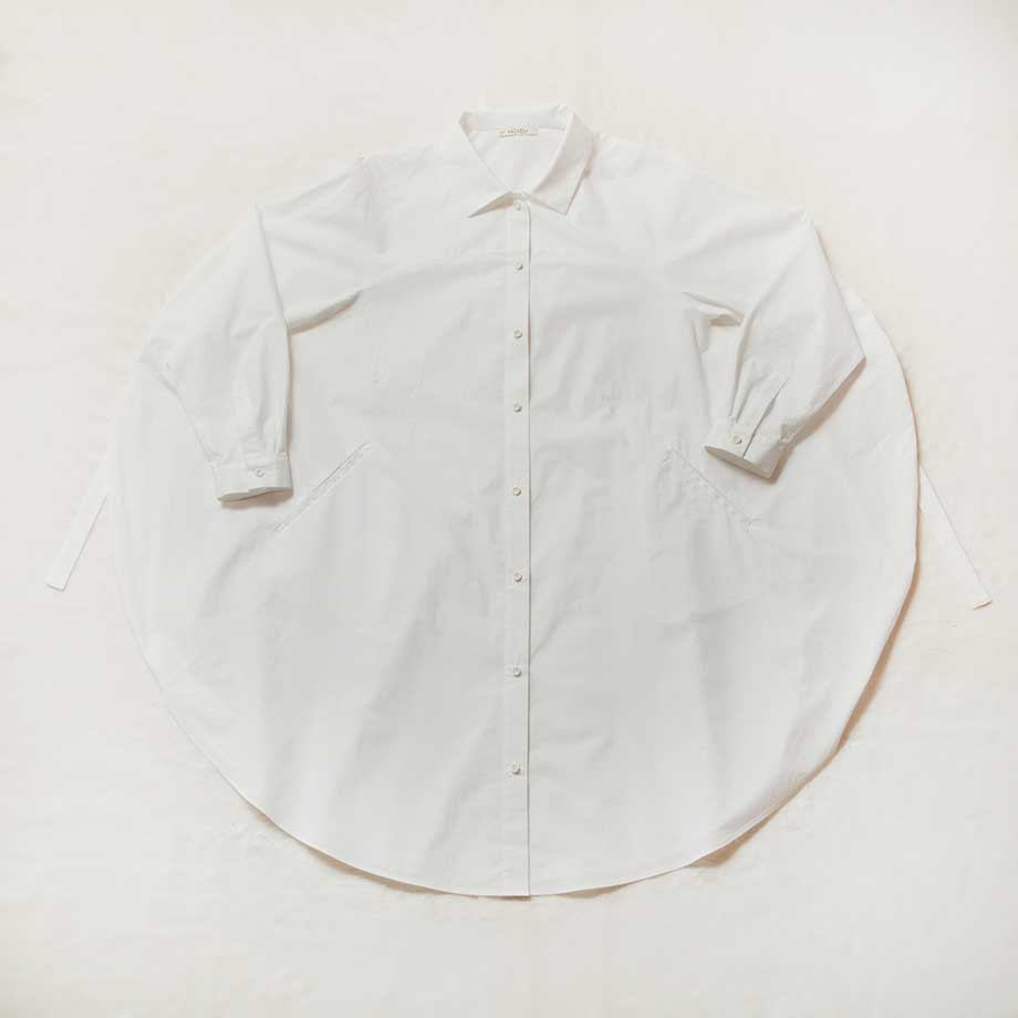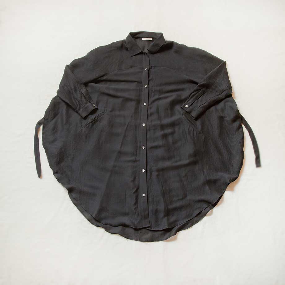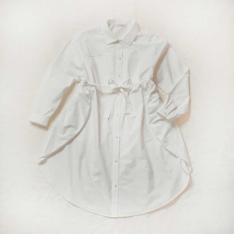 背中のシルエットが円形になっていてウエストのヒモを絞るとギャザーが生まれるデザイン。ヒモを後ろで結ぶか前で結ぶか、緩く絞るかタイトに絞るかなど、色々な着こなしができる。