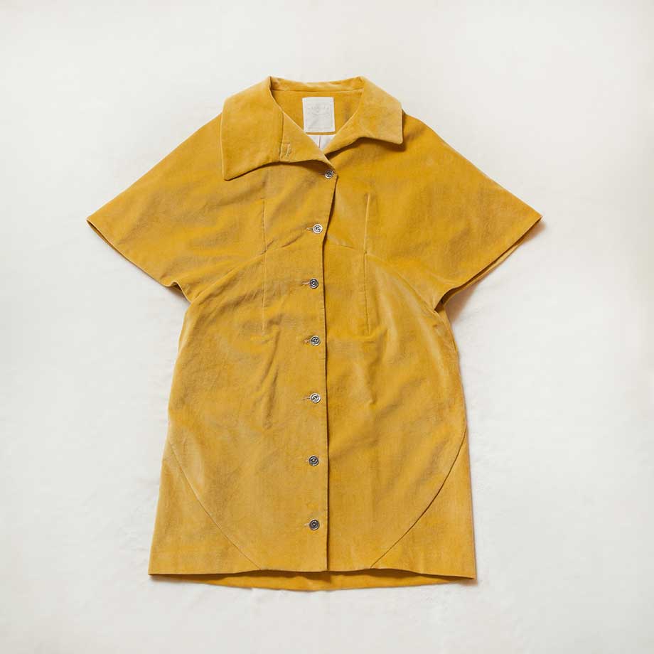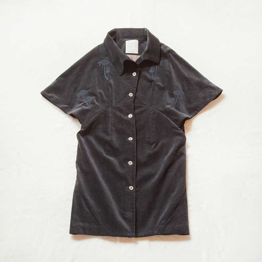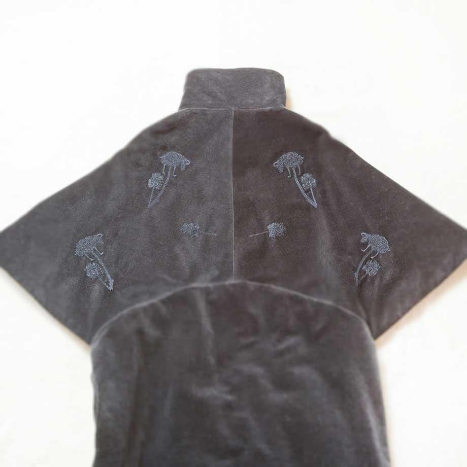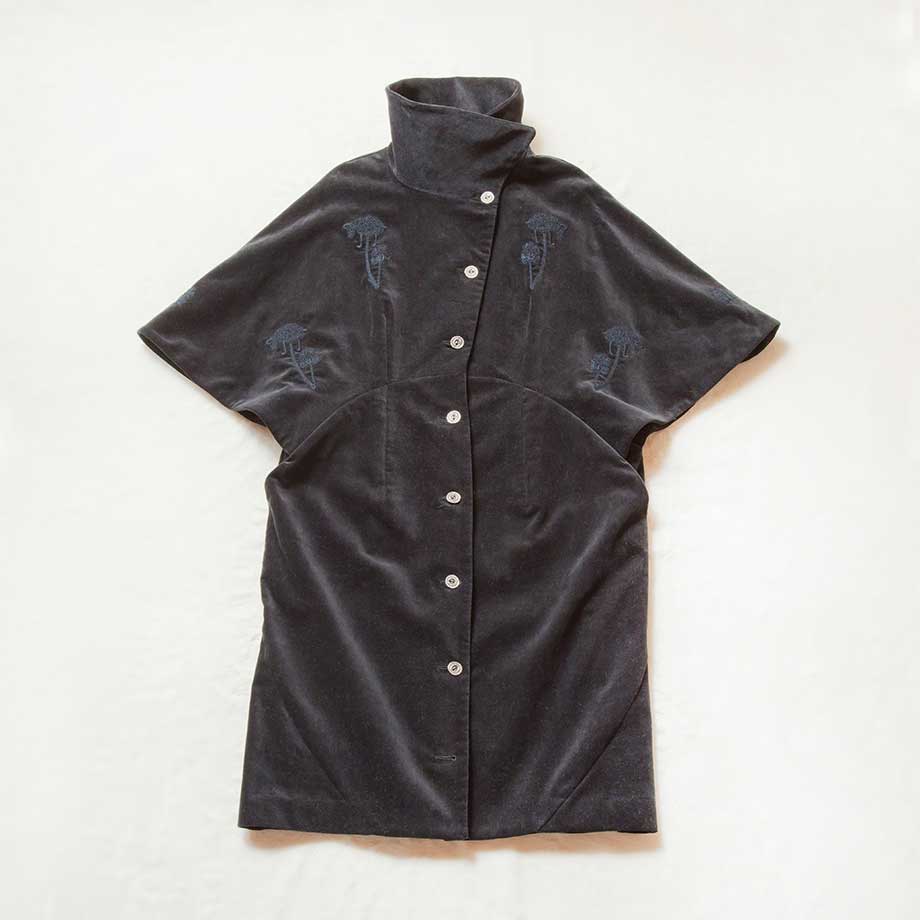 円形のラインになった脇の切り替えからケープのように開いた袖口まで繋がったパターンが360°にわたって独特のシルエットを生むワンピース。襟のアレンジも楽しめる。「ART embroidery」は袖口と背中にVEGETABLE LAMBの刺繍が入っている。