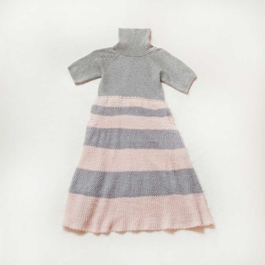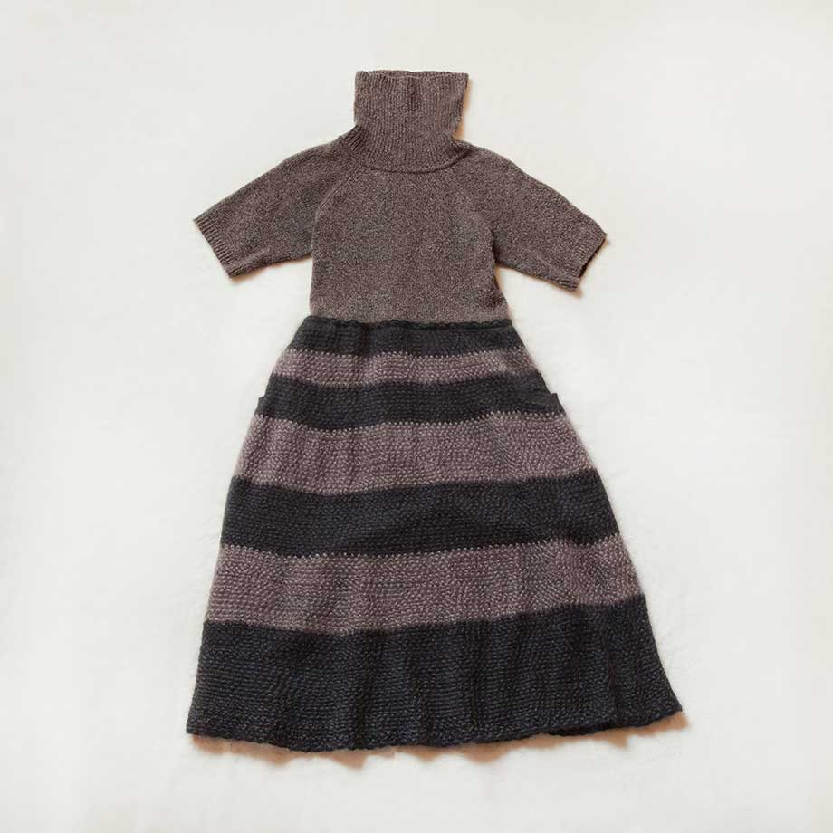 今は職人さんが少なくなった貴重な編み技術「ハマグリニット」で編まれたスカート部分のふんわりとした広がりが美しいニットワピース。