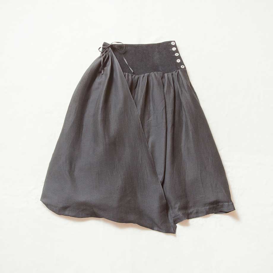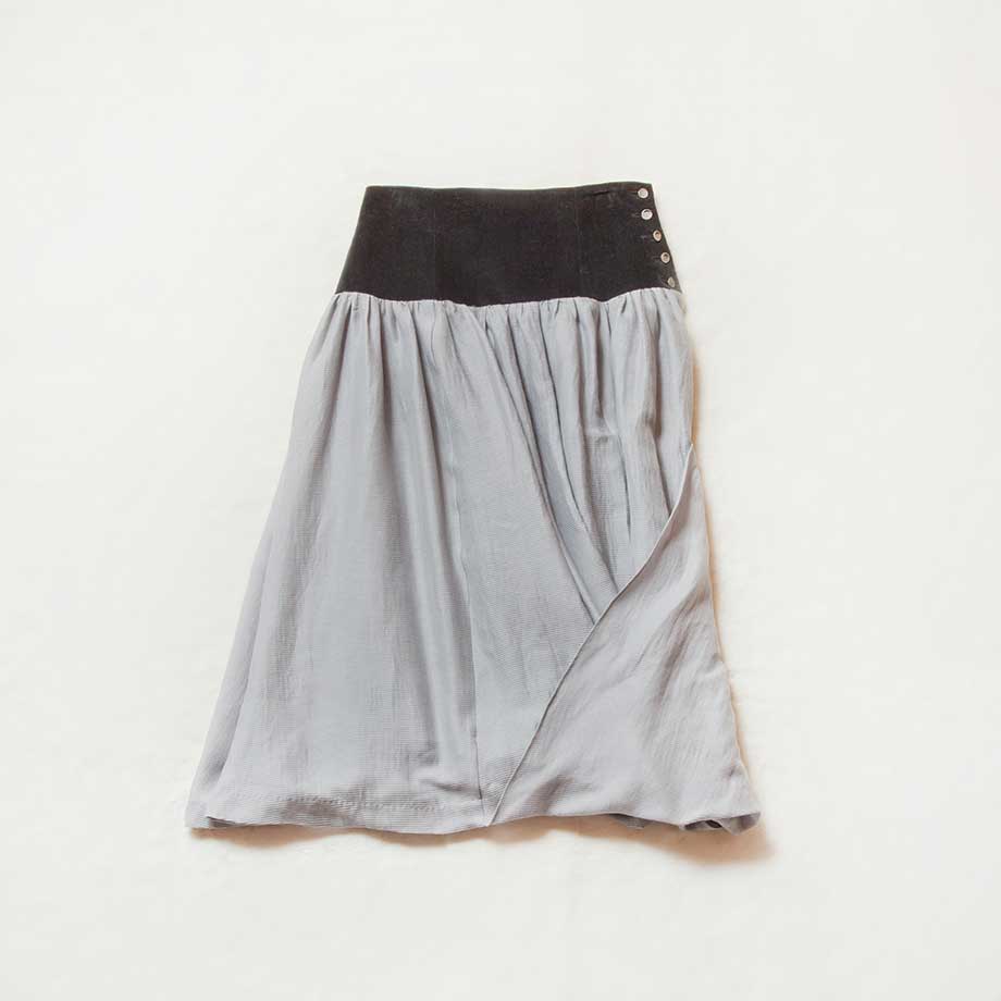 ロングスカートの前部分の裾が長いデザインで、折り返してウエストのハトメ穴にリボンで留められるようになっている。穴は4箇所あって留める位置によって様々なシルエットを演出できる。コルセット風のシャープなウエストラインはコーデュロイ生地。