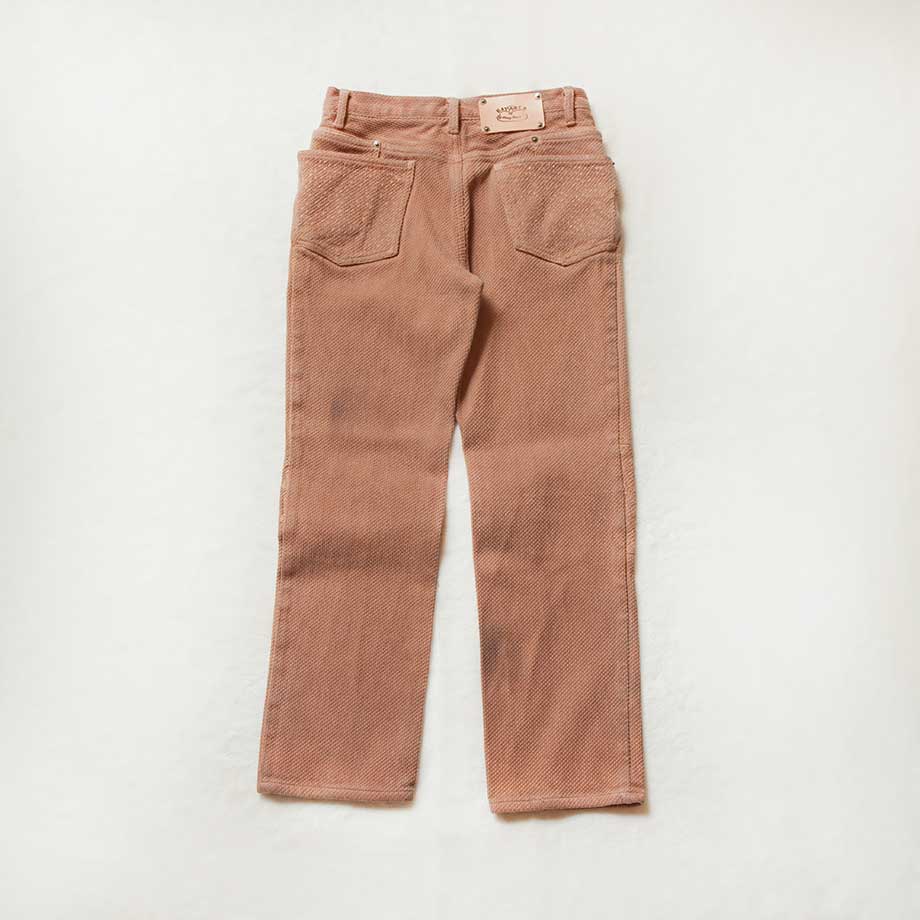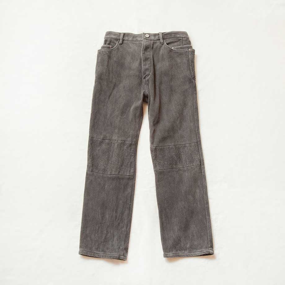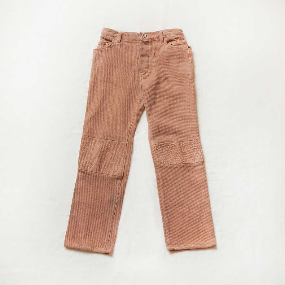 エタブル定番型のパンツ。綿花を摘む人の作業着からインスピレーションを得て膝あてがついているのがポイント。墨染め、柿渋染めで、風合いの変化を楽しめる。