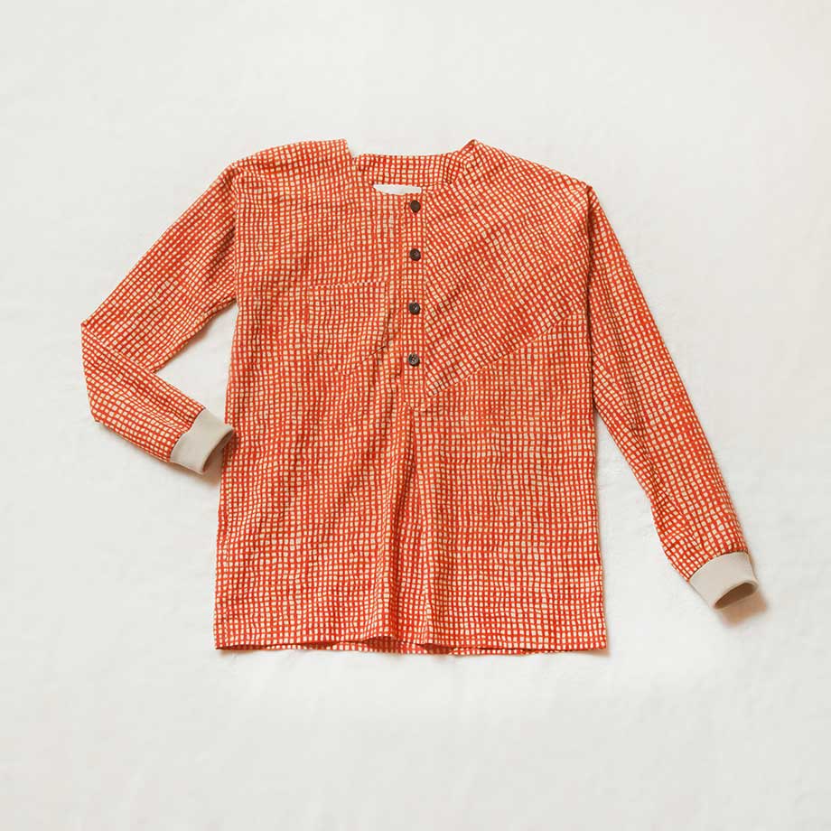 一年を通してサラリと着られるプルオーバーのブラウス。チェック柄の生地の切り替えづかいがアクセントになっている。