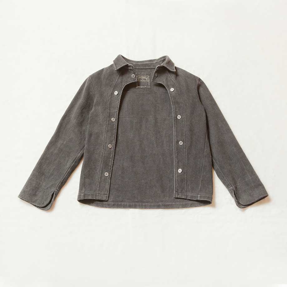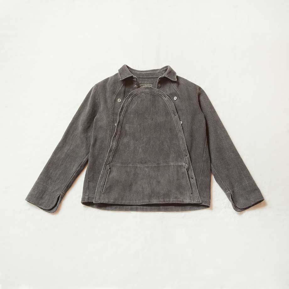 刺し子の生地を使ったブルゾン。山型に並ぶボタンでエプロンのように取り外しができる。一部ボタンを外したり、取り外した状態で羽織ったり、ユニークに着こなしを楽しめる。