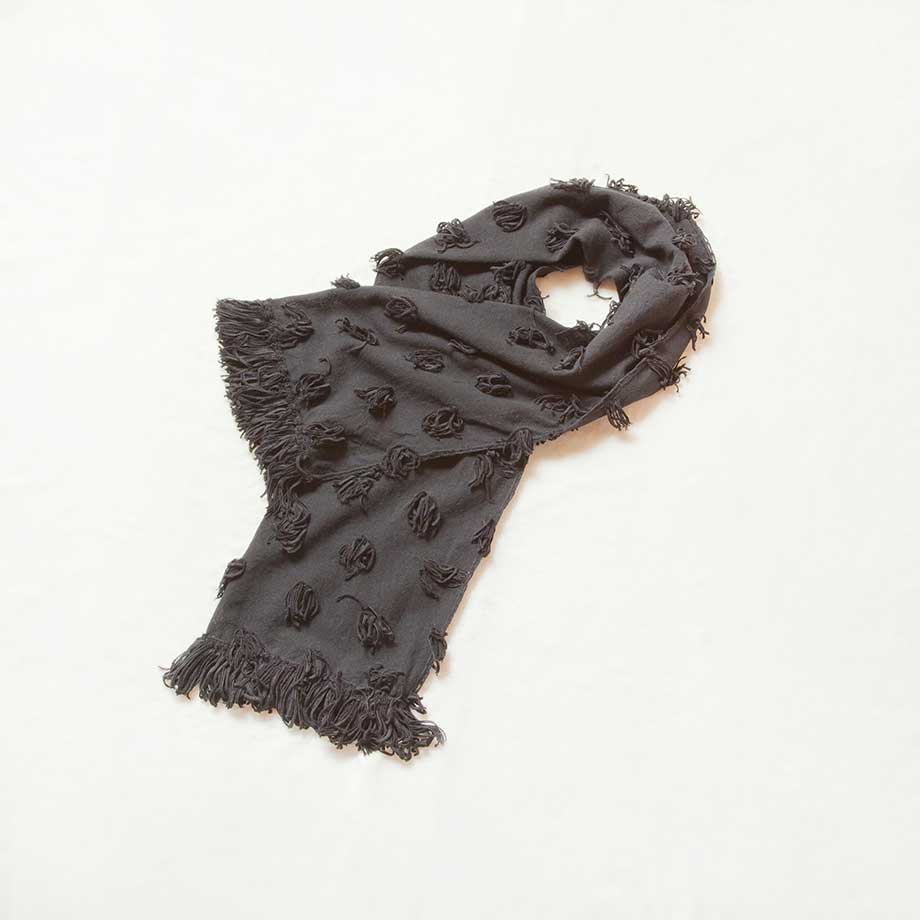 柔らかくて温かいマフラースカーフ。裾のフリンジは手編みで仕上げられている。